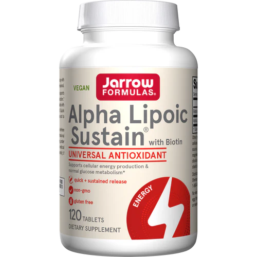 Alpha Lipoic Acid (ALA) is an antioxidant that supports normal glucose metabolism and cellular energy production.* Jarrow Formulas® Alpha Lipoic Sustain® is formulated with advanced bilayer Sustain™ tablets that combine 1/3 Quick Release and 2/3 Sustained Release formats to raise and to maintain ALA blood levels over time.