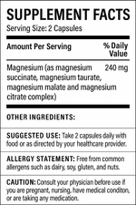 | Magnesium (as magnesium succinate, magnesium taurinate, magnesium malate and magnesium citrate complex) | 240 mg | 57% |