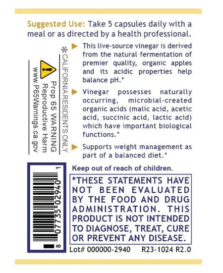 - Organically cultured apple cider vinegar (ACV) that is low temperature, air dried on organic rice extract