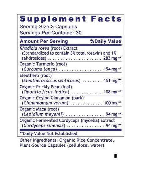 - Features the well-known botanical adaptogen, Rhodiola rosea