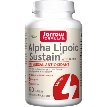 Alpha Lipoic Acid (ALA) is an antioxidant that supports normal glucose metabolism and cellular energy production.* Jarrow Formulas® Alpha Lipoic Sustain® is formulated with advanced bilayer Sustain™ tablets that combine 1/3 Quick Release and 2/3 Sustained Release formats to raise and to maintain ALA blood levels over time.