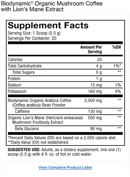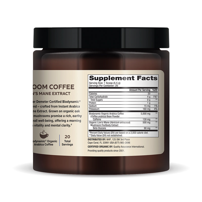 - The first-ever Demeter Certified Biodynamic mushroom coffee blend, our Biodynamic Organic Mushroom Coffee with Lion’s Mane (Hericium erinaceus) Extract supplies 500 mg of Organic Lion’s Mane Mushroom Fruitbody Extract, yielding 90 mg of valuable Beta Glucans per serving.®®
