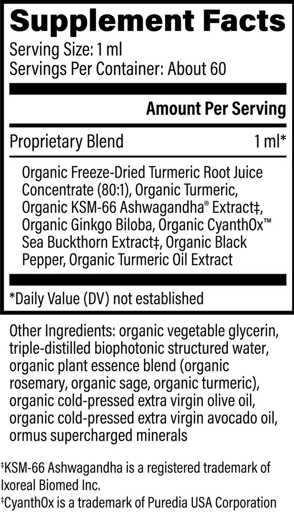 Organic Freeze-Dried Turmeric Root Juice Concentrate (80:1), Organic Turmeric, Organic KSM-66® Ashwagandha Extract, Organic Ginkgo Biloba, Organic CyanthOx™ Sea Buckthorn Extract, Organic Black Pepper, Organic Turmeric Oil Extract | Proprietary Blend |