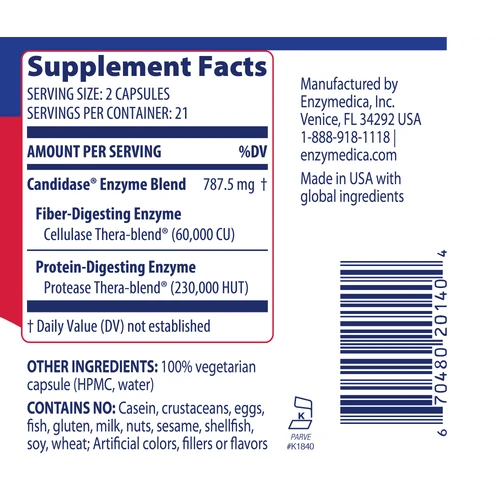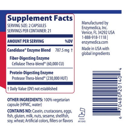 For acute symptoms: 2 capsules on an empty stomach, one hour before or two hours after a meal three times daily for 14 days. For more advanced support, Enzymedica’s Candidase™ Extra Strength may be helpful.