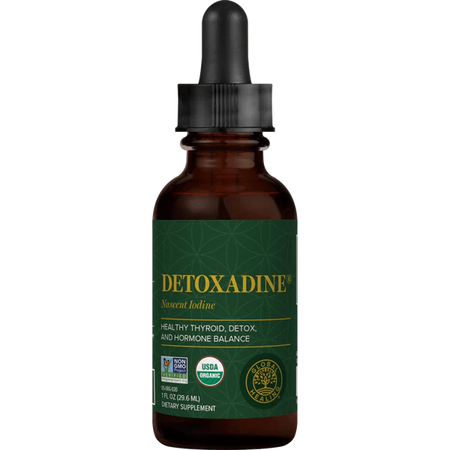 Detoxadine® is an organic nascent iodine supplement designed to nourish the thyroid, balance hormones, and promote natural detoxification. Extracted from ancient salt deposits over 7,000 feet below the Earth's surface, it delivers ultra-pure iodine in a vegetable glycerin base for rapid and gentle absorption. Each serving provides 1,950 mcg of iodine to support metabolism, energy, and overall vitality.