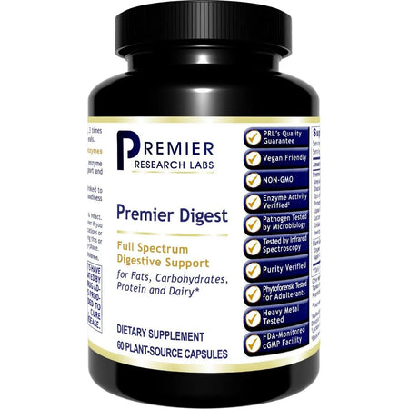 Premier Digest features Lipase enzymes to promote the breakdown of fats.* Amylase enzymes promote polysaccharide breakdown of starch and glycogen.* Invertase and lactase enzymes support digestion of carbohydrate disaccharides, including dairy.* Cellulase enzymes help break down plant cell wall components, promoting nutrient bioavailability of foods that contain fiber.* This formula offers two types of protease enzymes that facilitate the normal breakdown of proteins into dipeptides and tripeptides, as well as promoting optimal protease activity across a wide pH range.*