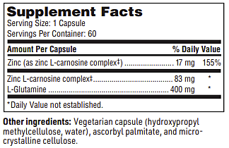 Zinc carnosine has been shown in multiple clinical trials to help protect the stomach lining and promote gastrointestinal comfort.† Studies show zinc carnosine promotes healthy mucus secretion, exerts antioxidant properties, and modulates cytokine expression, thus helping protect the stomach and small intestine.† L-glutamine promotes small intestinal cell function and mucosal integrity to further support gastric function and protect tissues.†