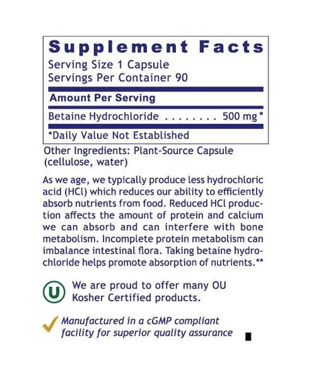 As we age, we typically produce less hydrochloric acid (HCl) which reduces our ability to efficiently absorb nutrients from food. Betaine hydrochloride helps promote the absorption of nutrients.* When reduced HCl production is present, it affects the amount of protein and calcium we can absorb and can interfere with bone metabolism. Incomplete protein metabolism can imbalance intestinal flora.