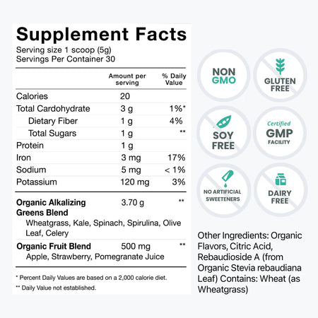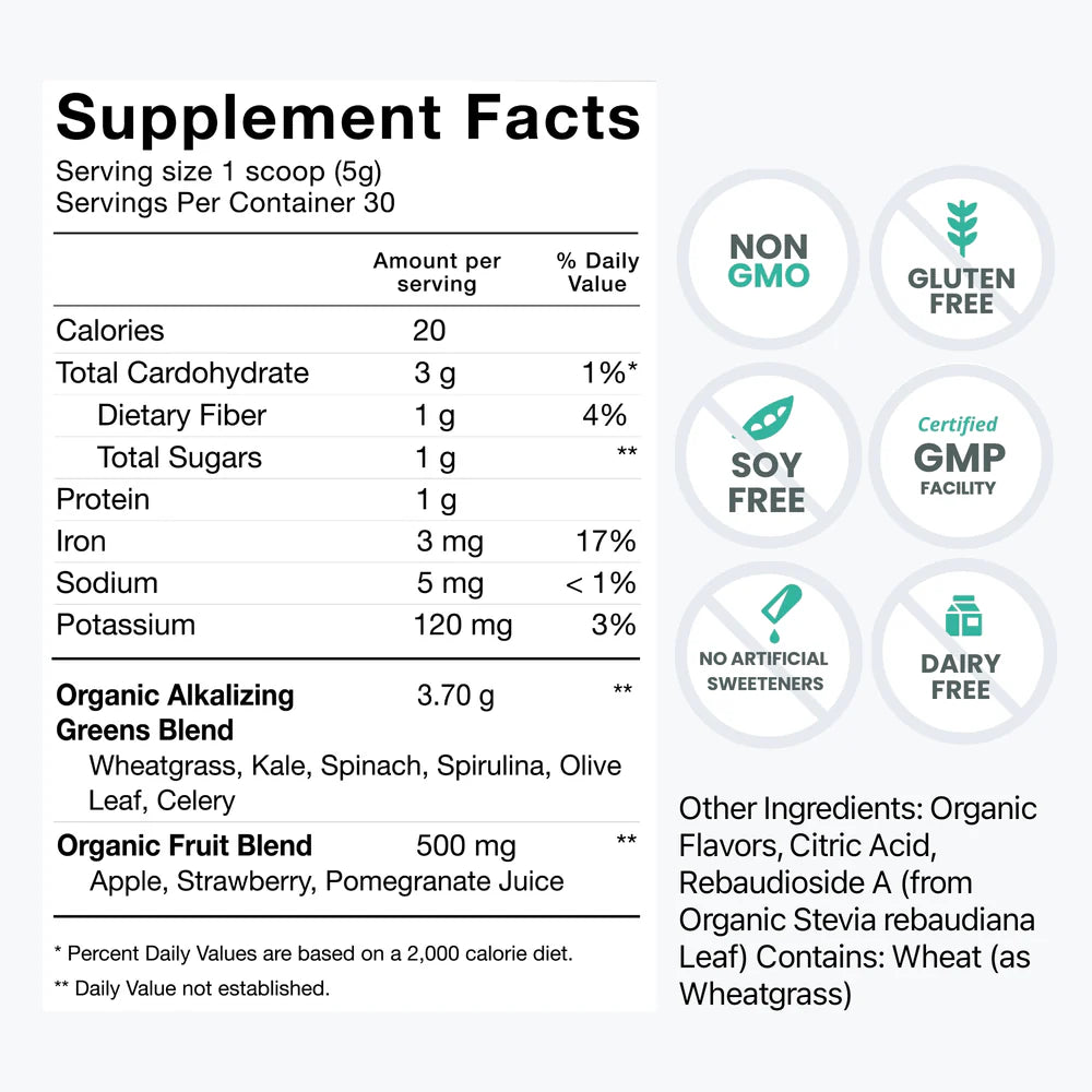 - Excellent source of greens and reds (6 greens, 3 superfruits)
