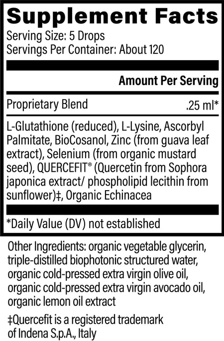| L-Glutathione (reduced), L-Lysine, Ascorbyl Palmitate, BioCosanol, Zinc (from guava leaf extract), Selenium (from organic mustard seed), QUERCEFIT® (Quercetin from Sophora japonica extract / phospholipid lecithin from sunflower), Organic Echinacea | |