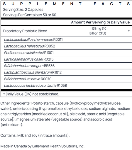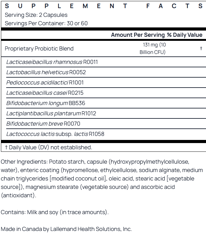 | Proprietary Probiotic Blend Lacticaseibacillus rhamnosus R0011 Lactobacillus helvetius R0052 Pediococcus acidilactici R1001 Lacticaseibacillus casei R0215 Bifidobacterium longum BB536 Lactiplantibacillus plantarum R1012 Bifidobacterium breve R0070 Lactococcus lactis subsp. lactis R1058 |