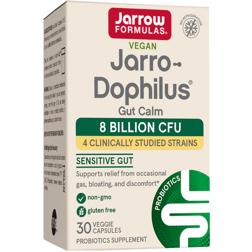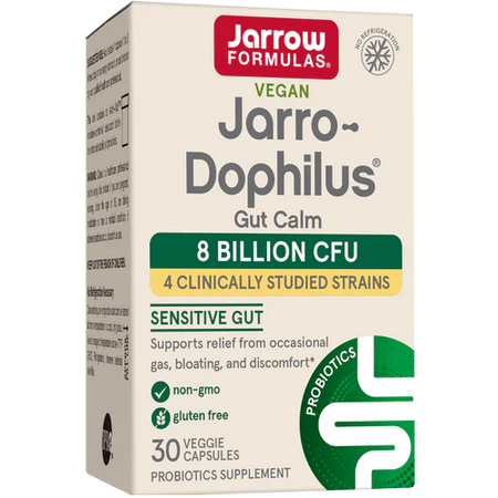 Jarro-Dophilus® Gut Calm combines the clinically documented probiotic yeast Saccharomyces boulardii with 3 patented probiotic bacteria strains clinically shown to calm the gut.* These patented probiotic strains support relief from occasional gas, bloating, and discomfort from gut irregularity and lactose.* S. boulardii aids the integrity of the cells  lining the gut, promotes digestive enzyme production, and supports the growth of good bacteria.*