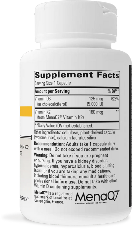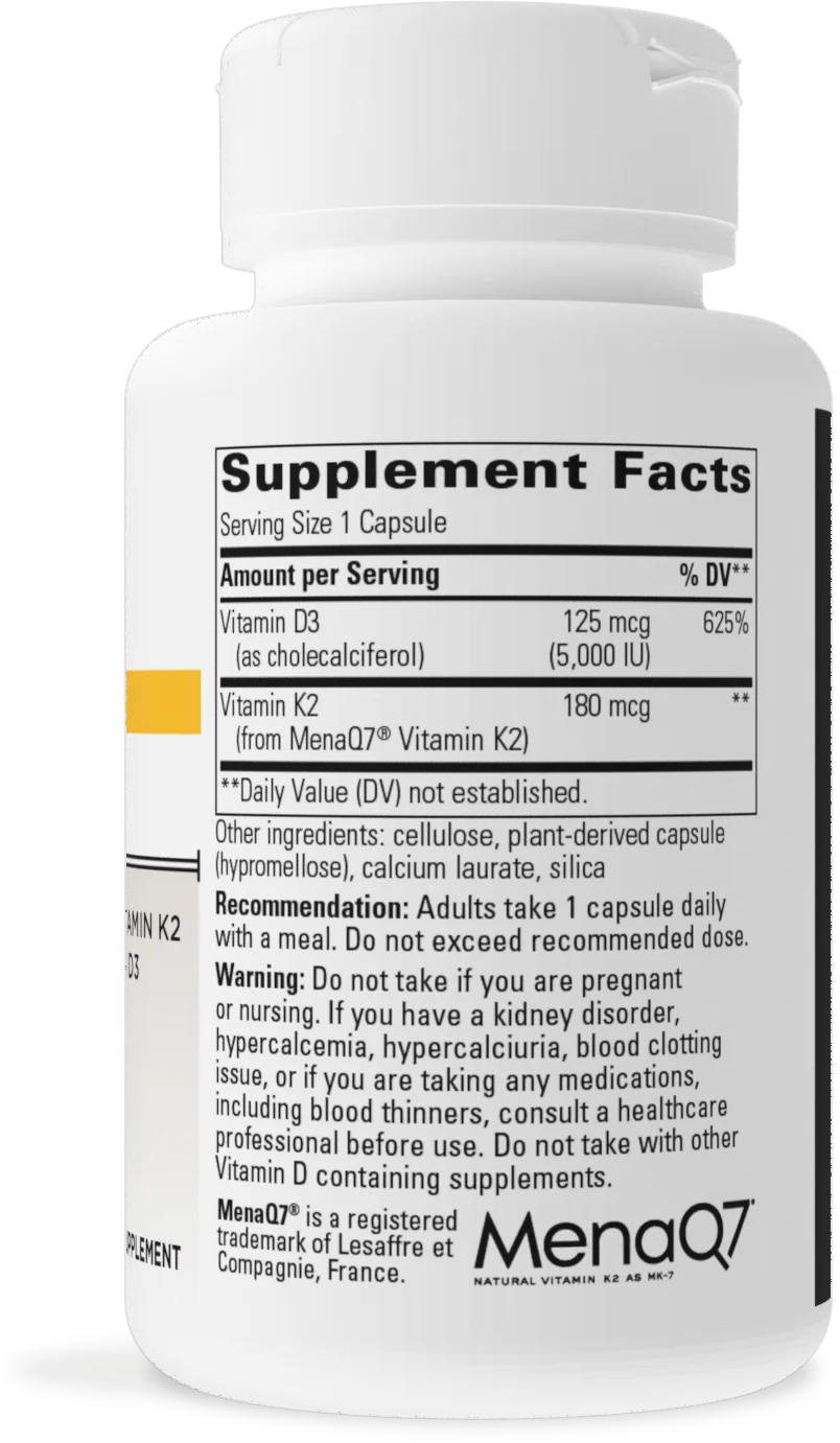 K2 + D3 provides cardiovascular and bone support with clinically studied MenaQ7® vitamin K2 plus high potency vitamin D3.* The two vitamins complement one another to help the body absorb and use calcium for healthy bone support.* Vitamin K2 helps transport calcium away from the blood vessels by decreasing levels of the inactive form of Matrix Gla-Proteins (MGPs).* Active MGPs bind calcium in the blood and support healthy calcium deposition in bones.* (MenaQ7® is a registered trademark of Lesaffre et Compagnie, France.)