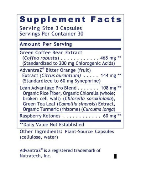 - Features green coffee bean extract, AdvantraZ® bitter orange extract, and raspberry ketones
