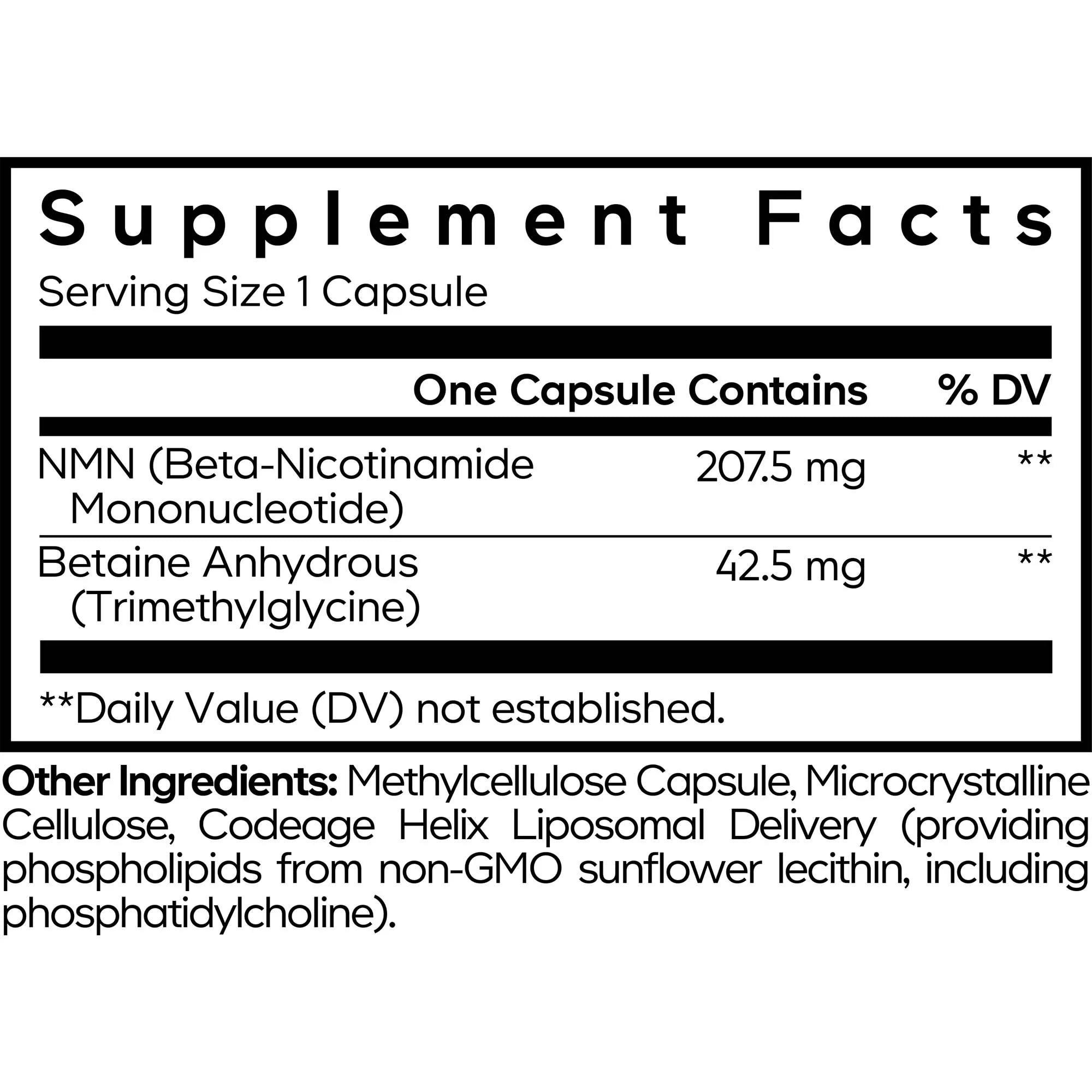 - Includes betaine anhydrous (TMG), a methyl donor that complements NMN.