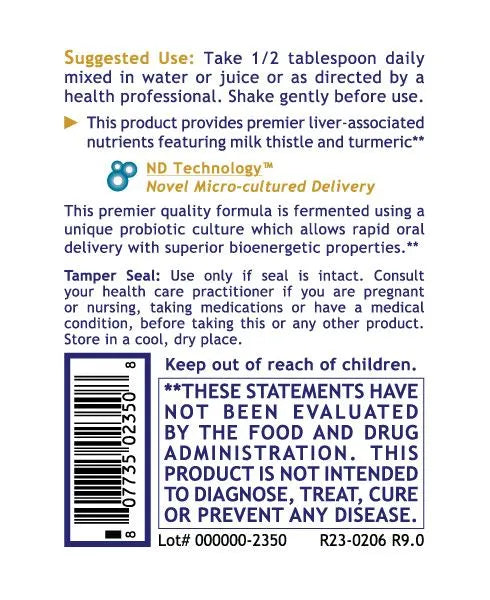 Liver-ND™ provides a unique, probiotic-fermented formula that supports the liver's natural detoxification process and overall liver support.* This formula features fermented milk thistle seed and fermented milk thistle extract and also fermented organic turmeric rhizome and turmeric extract.