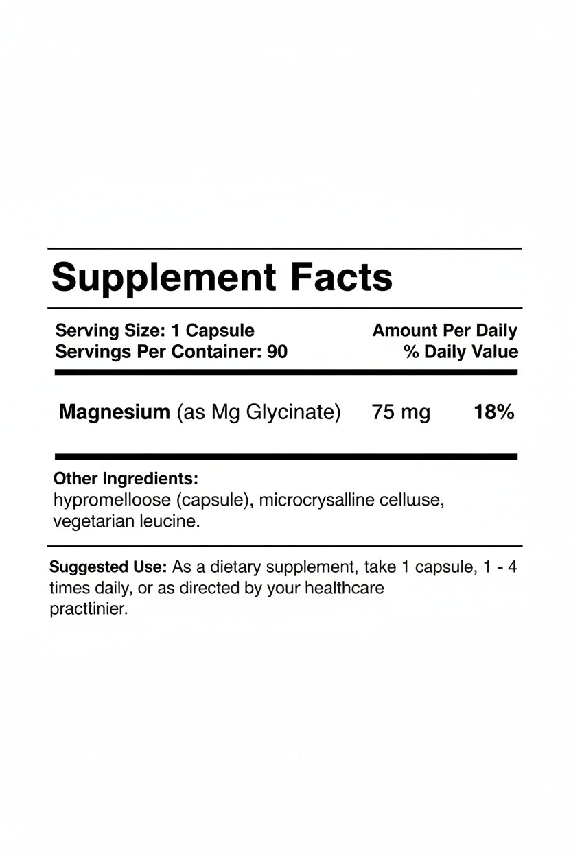 Each capsule delivers 75 mg of elemental magnesium (as magnesium glycinate) in a convenient once-to-multiple daily dosing format.