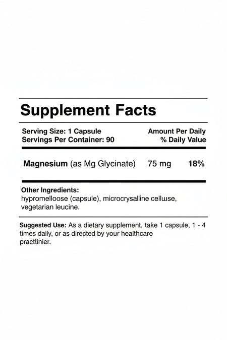 | Magnesium (as Magnesium Glycinate) | 75 mg | 18% |