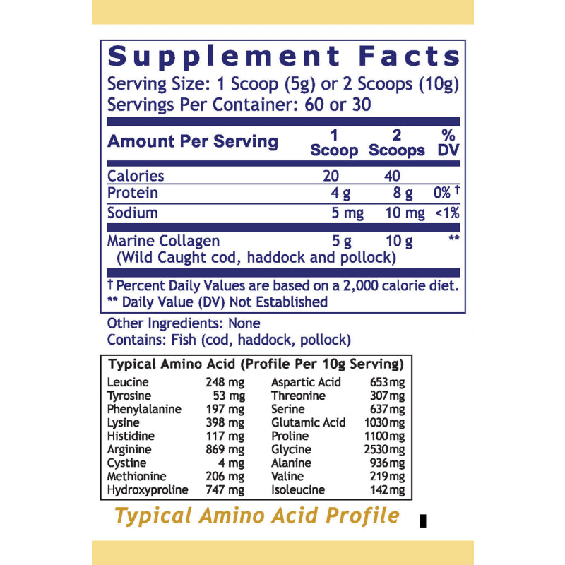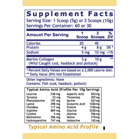 | Marine Collagen (Wild Caught cod, haddock and pollock) | 5 g | 10 g | Daily Value not established |