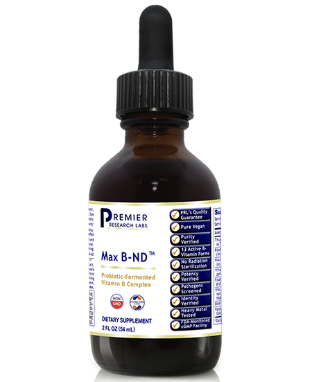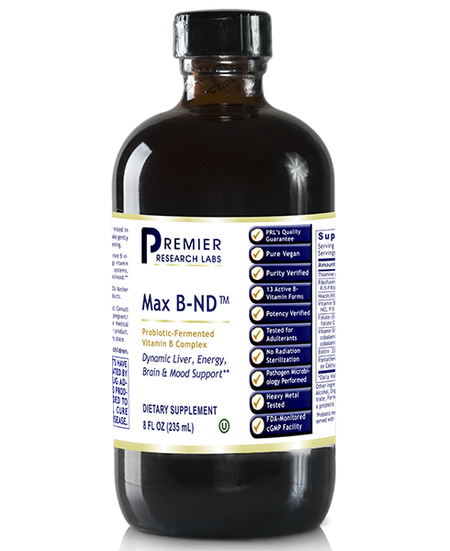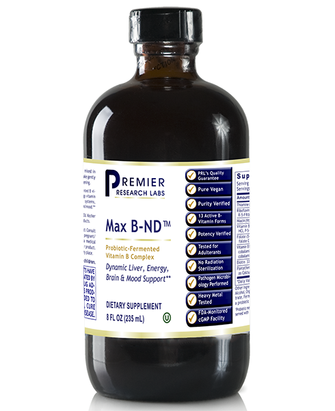 Max B-NDTM is a nutritional industry first - with never before available probiotic-fermented B vitamins. This product contains a high-energy B vitamin complex that delivers premier nutritional support.* Each 1/2 tsp. supplies high energy vitamin B forms including B5 as pantothenic acid, vitamin B2 in the riboflavin-5-phosphate form and more.