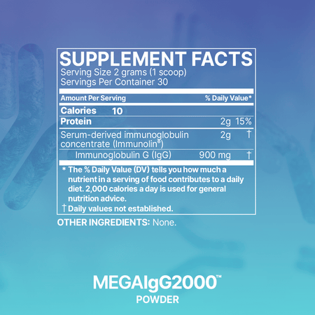 Mega IgG2000™ Powder is a purified, dairy-free immunoglobulin concentrate designed to support gut barrier function, immune regulation, and gastrointestinal detoxification. Unlike colostrum-based supplements, Mega IgG2000™ is derived from bovine serum and contains no lactose, casein, or β-lactoglobulin — making it suitable for individuals with dairy sensitivities.