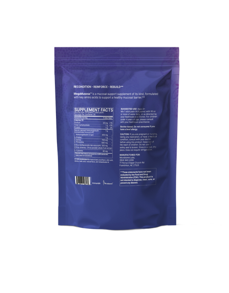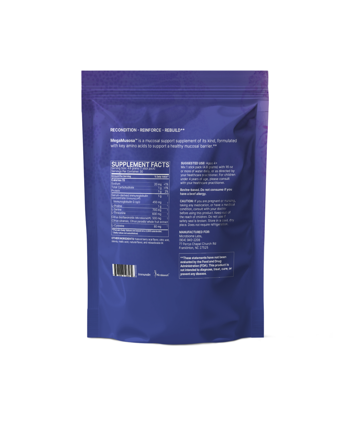 MegaMucosa™ Sticks deliver the same clinically studied formula as the powder version — now in convenient, single-serve packets for on-the-go use. This comprehensive formula is designed to rebuild the intestinal mucosal barrier, strengthen gut immunity, and support microbial diversity. Each stick provides a precise blend of serum-derived immunoglobulins, four key amino acids, and MicrobiomeX® — a patented citrus polyphenol complex known to enhance short-chain fatty acid (SCFA) production.