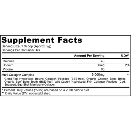 Multi-Collagen Complex: Grass-Fed Hydrolyzed Bovine Collagen Peptides (BSE-free), Organic Chicken Bone Broth, Organic Beef Bone Broth (BSE-free), Wild-Caught Hydrolyzed Fish Collagen Peptides (Cod, Snapper), Egg Shell Membrane Collagen.