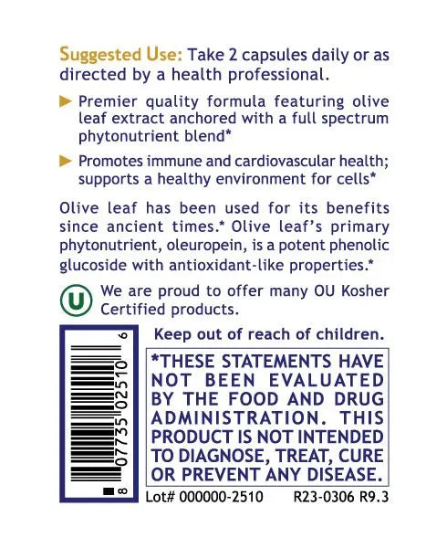 Olive leaf extract has been popular as an herbal remedy in many cultures. Olive leaf extract features the naturally occurring phytonutrient, oleuropein, a phenolic glucoside. The olive leaf extract used in this formula contains the highest concentration of oleuropein (minimum 20% oleuropein) available.