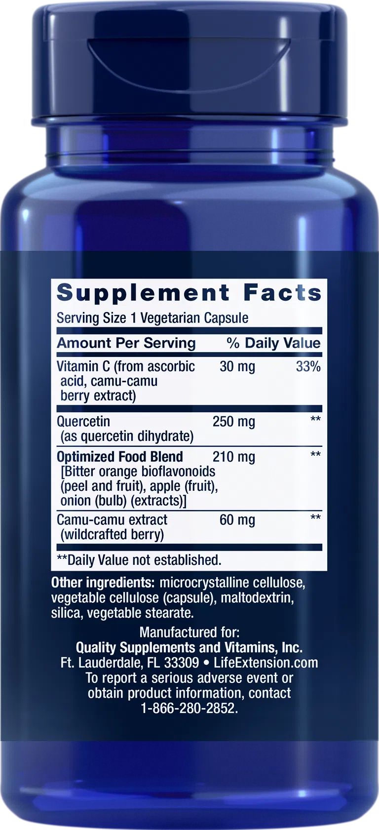 Our Optimized Quercetin blend also contains vitamin C, an optimized food blend from onions, bitter orange, and apple, and camu-camu (Myrciaria dubia) berry extract. Camu-camu is a tropical fruit rich in vitamin C. These nutrients were included as sources of quercetin, vitamin C, and other phytonutrients for added antioxidant support.