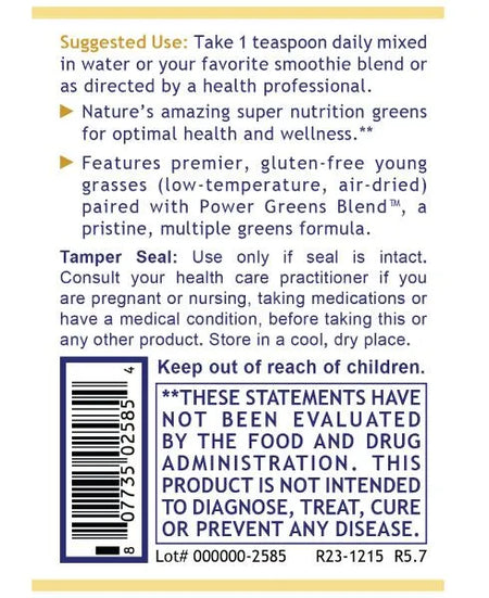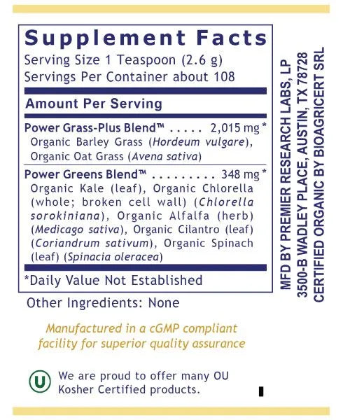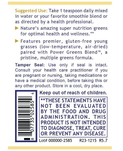 Premier Greens is a once living, naturally potent, vegetarian blend of the finest, most pristine greens from the best sources worldwide. This gluten free plant blend features our pristine Organic Barley Grass, Organic Oat Grass, Organic Kale, Organic Chlorella plus a garden blend of 100% vegetarian greens carefully harvested and low-temperature air-dried to preserve the broad array of naturally occurring vitamins and minerals to help support the natural alkalinity of the body.*