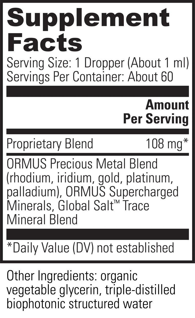 | ORMUS Precious Metal Blend (rhodium, iridium, gold, platinum, palladium), ORMUS Supercharged Minerals, Global Salt™ Trace Mineral Blend | |