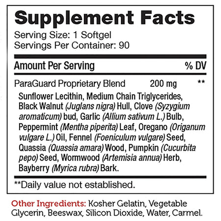 ParaGuard Proprietary Blend Sunflower Lecithin, Medium Chain Triglycerides, Black Walnut (Juglans nigra) Hull, Clove (Syzygium aromaticum) bud, Garlic (Allium sativum L.) Bulb, Peppermint (Mentha piperita) Leaf, Oregano (Origanum vulgare L.) Oil, Fennel (Foeniculum vulgare) Seed, Quassia (Quassia amara) Wood, Pumpkin (Cucurbita pepo) Seed, Wormwood (Artemisia annua) Herb, Bayberry (Myrica rubra) Bark. |
