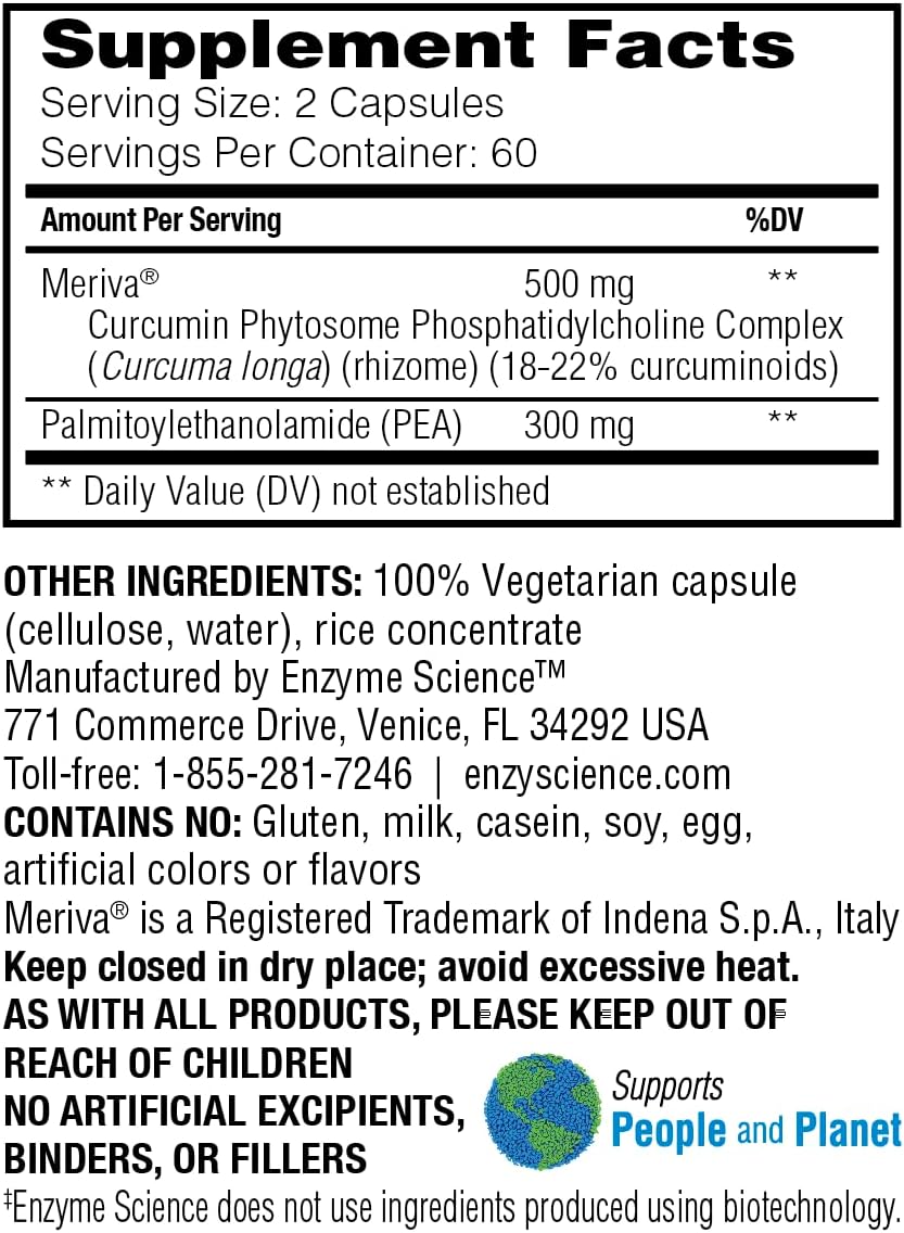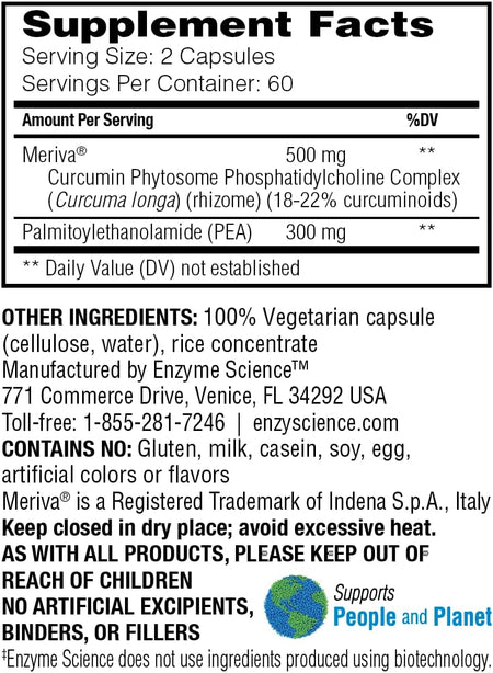 (PEA)+ only utilizes naturally derived palmitoylethanolamide from safflower seeds rather than the synthetic solvent alternatives that are commercially available. Since PEA is a lipid that has a large particle size in its unprocessed state, that can limit its solubility and bioavailability. However, ultra-micronized PEA has been processed using an air-jet milling technique. Ultra-micronized PEA offers greater absorption to support optimal nerve activity .*In addition, clinically studied Meriva® curcumin is highly bioavailable versus traditional forms for faster benefits.*