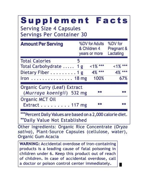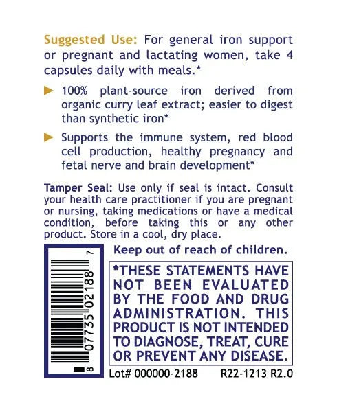 Premier Phyto-Iron is a scientifically formulated nutritional supplement designed to deliver body-friendly iron as highly bioavailable, plant-based iron (non-heme form) that has been concentrated from non-GMO, organic certified curry leaf extract. It offers an excellent 18 mg iron per serving.