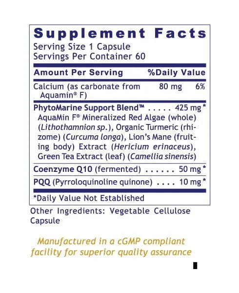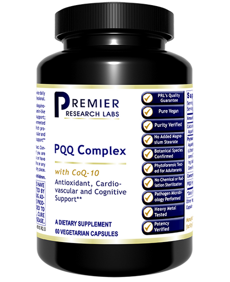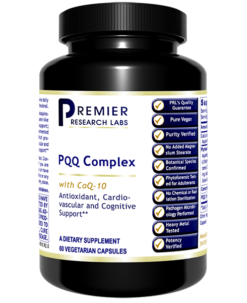 PQQ Complex with CoQ10 features PQQ (pyrroloquinoline quinone), a unique B vitamin-like nutrient. It offers nerve, cardiovascular and cognitive (learning and memory) support.* This formula is coupled with natural source, fermented CoQ10 (trans isomer form) which promotes cellular energy and offers premier antioxidant support.* This formula is anchored by PhytoMarine Support, a biocompatible botanical blend that offers broad spectrum phyto-nutritional support.*