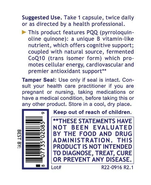 - Features PQQ (pyrroloquinoline quinone) and the fermented trans isomer form of CoQ10