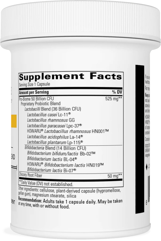 Pro-Biome 50 Billion daily probiotic contains 10 diverse probiotic strains, including clinically studied strains (HN019™, HN001™, BL-04®, Bi-07®), in a delayed-release capsule to support gastrointestinal health as well as immune health.* Each serving of Pro-Biome has 50 billion live probiotic cultures plus prebiotics, a food source for good bacteria.
