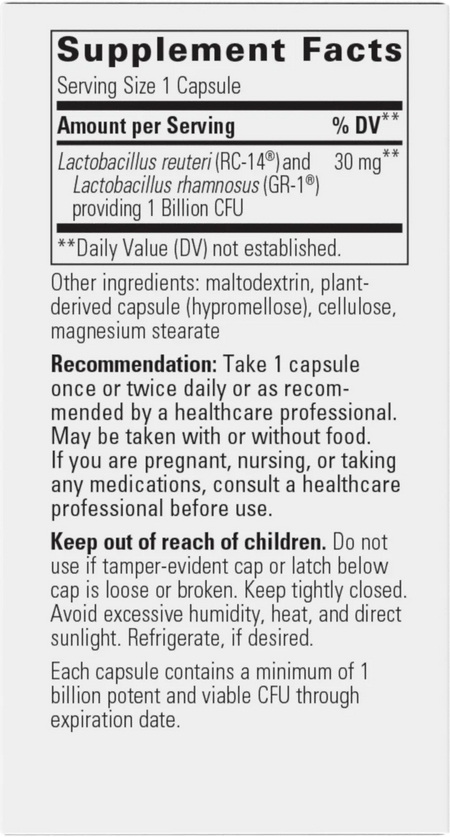 | Lactobacillus reuteri (RC-14®) and Lactobacillus rhamnosus (GR-1®) providing 1 Billion CFU | 30 mg |