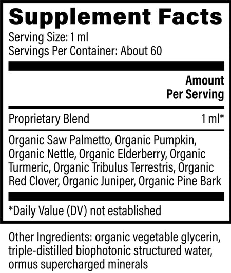 | Organic Saw Palmetto, Organic Pumpkin, Organic Nettle, Organic Elderberry, Organic Turmeric, Organic Tribulus Terrestris, Organic Red Clover, Organic Juniper, Organic Pine Bark | |