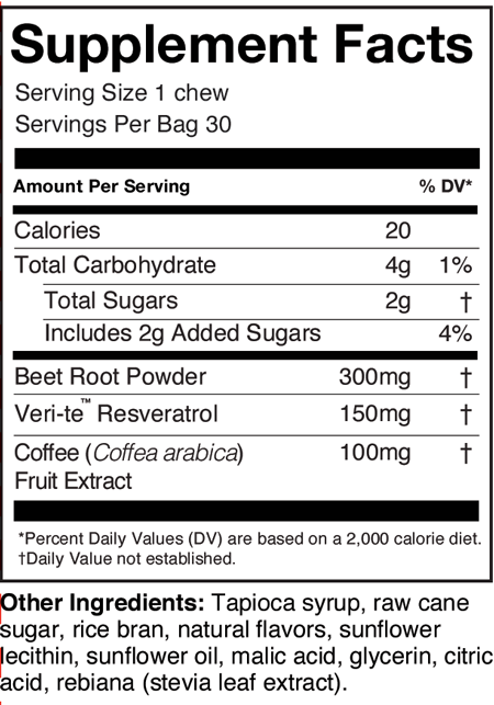 Feel your most focused with antioxidant-powered brain health support in a delicious pomegranate-blueberry flavored soft chew. Clinically researched Fermented Resveratrol and patented Coffee Fruit Extract combine to promote healthy blood flow to the brain and help support: