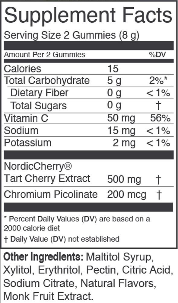 Doctor-formulated and sugar free gummy to support daily metabolic health featuring clinically-researched Tart Cherry Extract plus Vitamin C and Chromium.