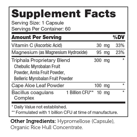 The Daily Cleanse, formerly ConstipAid, contains a powerful blend of specialized probiotics and digestion-regulating compounds, such as Triphala, Cape Aloe, Baccilus Coagulans and more, to assist with occasional constipation and help move the ’process of elimination’ along naturally and regularly.
