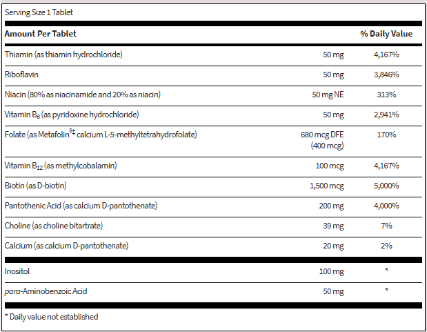 A full complement of bioavailable essential B-vitamins plus related nutrients in high-potency amounts.†