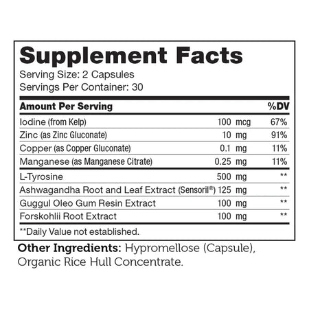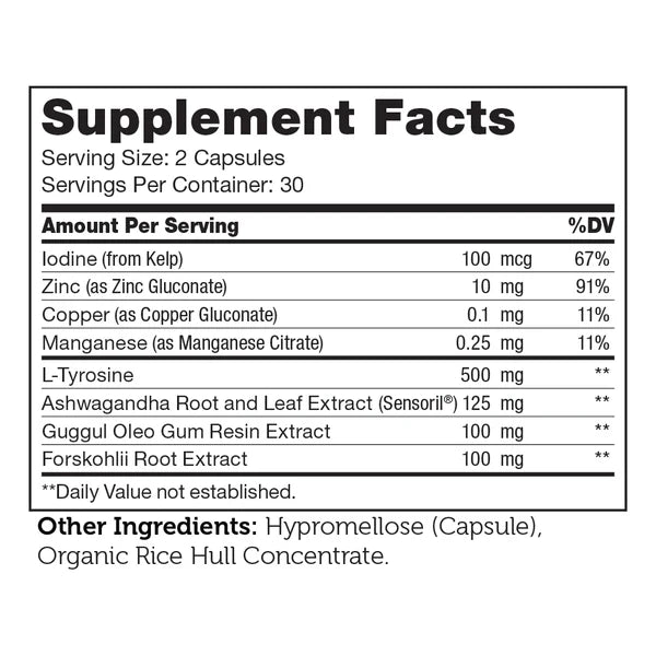 A critical gland in the endocrine system, the thyroid regulates and affects metabolism, energy, brain development and digestive functions, as well as overall well-being. Thyraid contains Iodine, Zinc, L-Tyrosine, Ashwagandha and much more, which all help support and maintain thyroid health.