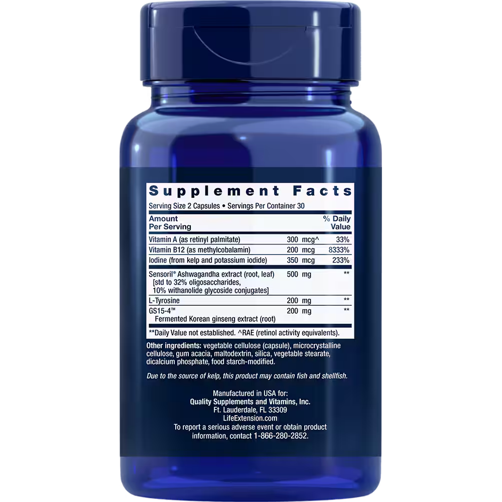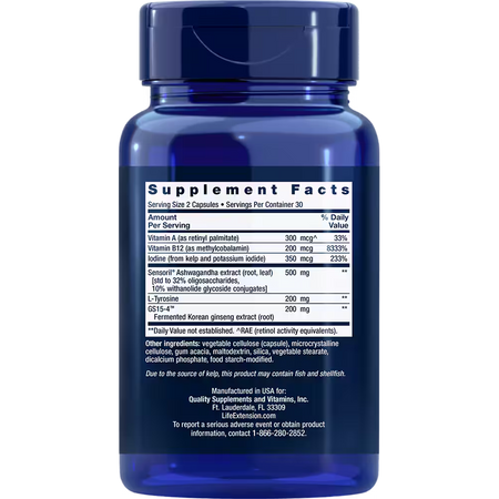 Thyroid Support Complex combines ashwagandha, iodine, Korean ginseng and more to promote the healthy production of thyroid hormones and the conversion of thyroid hormones into their active states. In addition, this formula contains vitamin B12 for healthy thyroid activity and vitamin A to support healthy serum T3 (active thyroid hormone) levels.