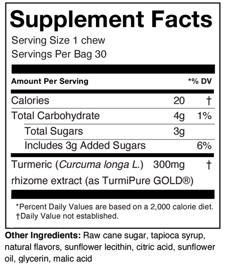 Each single serving chew provides 300mg of TurmiPure® Gold turmeric extract to support a healthy inflammatory response and joint health. An unmatched low dose compared to the typical 1922mg of standard turmeric extract.