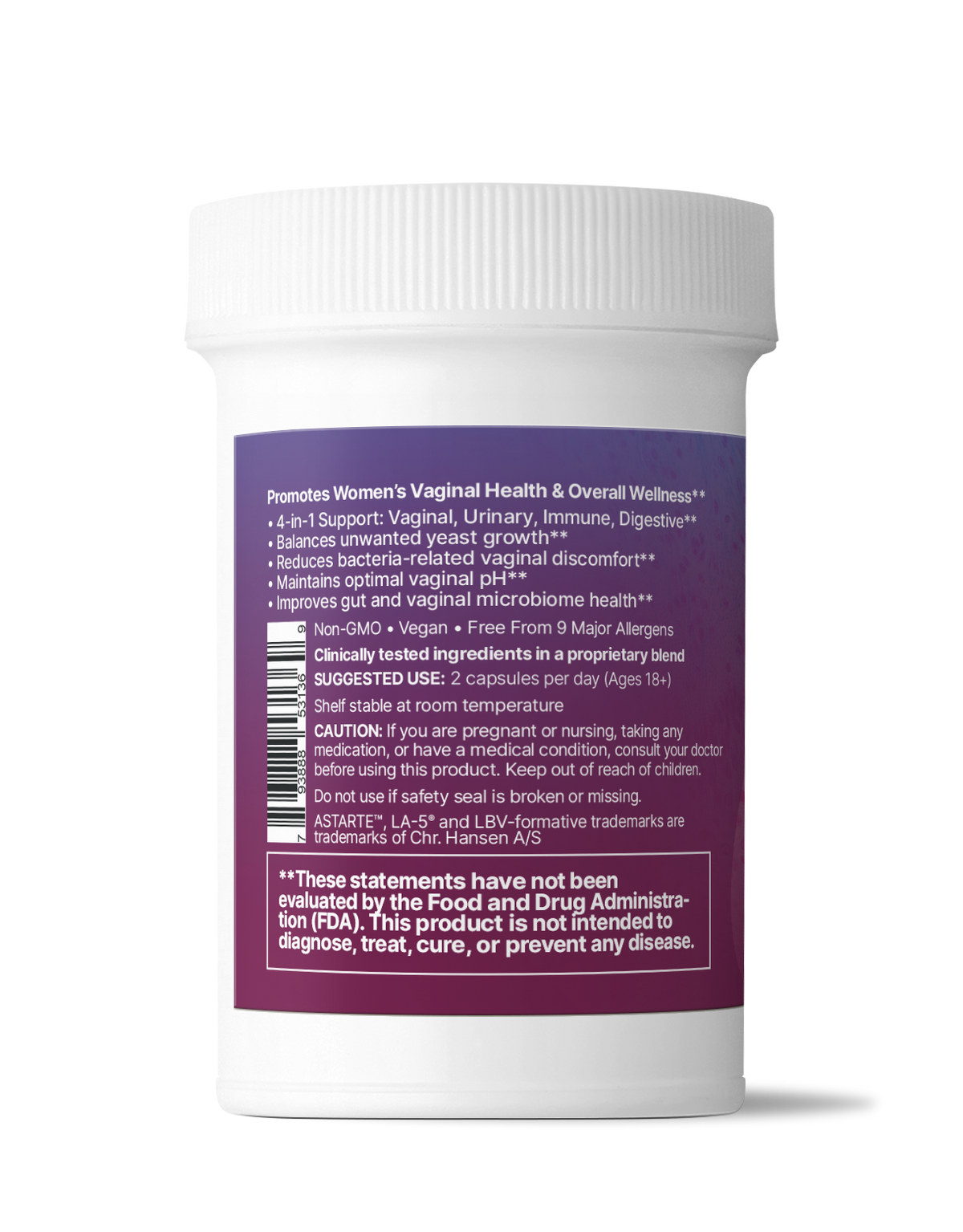 Vaginal Balance is a scientifically formulated women’s probiotic supplement designed to support the health of the vaginal microbiome, urinary tract, digestive system, and immune function. Powered by a proprietary probiotic blend — including the clinically validated ASTARTE™ and Lactobacillus acidophilus LA-5® — plus 500 mg of Cranberry Powder, it delivers targeted microbial support to maintain optimal pH, balance yeast populations, and reduce bacteria-related vaginal discomfort.