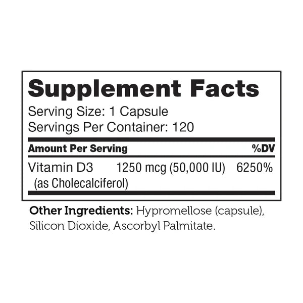 | Vitamin D3 (as Cholecalciferol) | 1250 mcg (50,000 IU) | 6250% |
