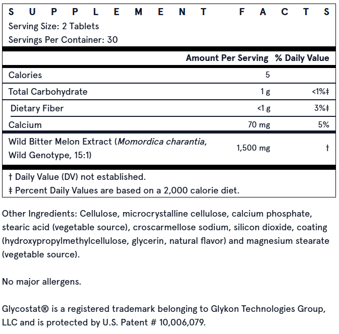 | Wild Bitter Melon Extract (Momordica charantia, wild genotype, 15:1) | 1,500 mg | † |